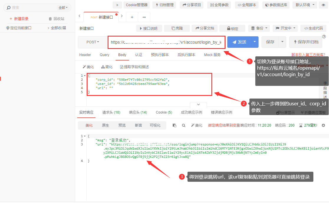 2、调用登录账号接口(接口文档),传入上面获取的user_id、corp_id得到登录跳转url,使用该url可在浏览器中直接跳转登录