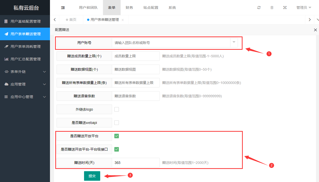 1、登录私有云管理后台https://私有云域名/admin,选择表单->用户表单赠送管理->赠送